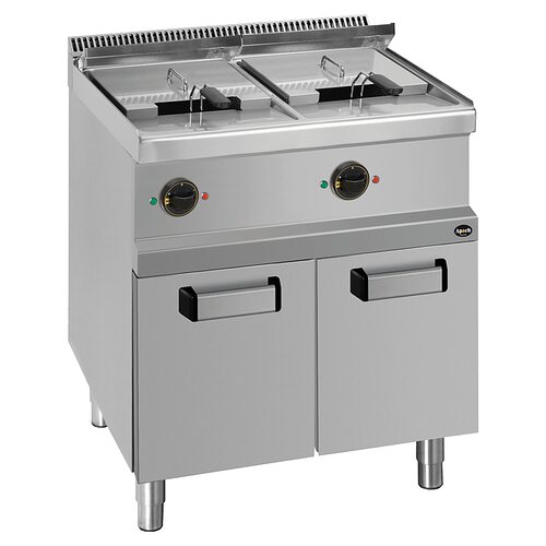 Фритюрница Apach APFE-77P 700-й серии предназначена для приготовления блюд в масле на предприятиях общественного питания и торговли. Модель оснащена электромеханической панелью управления и закрытой подставкой с регулируемыми по высоте ножками. Во фритюрнице предусмотрена холодная зона, что позволяет увеличить время использования масла. Корпус, ванны, рабочая поверхность, панель управления и вытяжная решетка выполнены из нержавеющей стали AISI 304, боковые и задняя панели - из нержавеющей стали AISI 430, корзины - из хромированной стальной проволоки, нагревательные элементы, фильтры и крышки корзин - из нержавеющей стали.