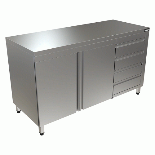 Особенности:- столешница - нерж. сталь. aisi 430,- усиление ЛДСП,- каркас разборный из нерж. стали 430,- 4 выдвижных ящика,- распашные двери,- полка,- без борта.